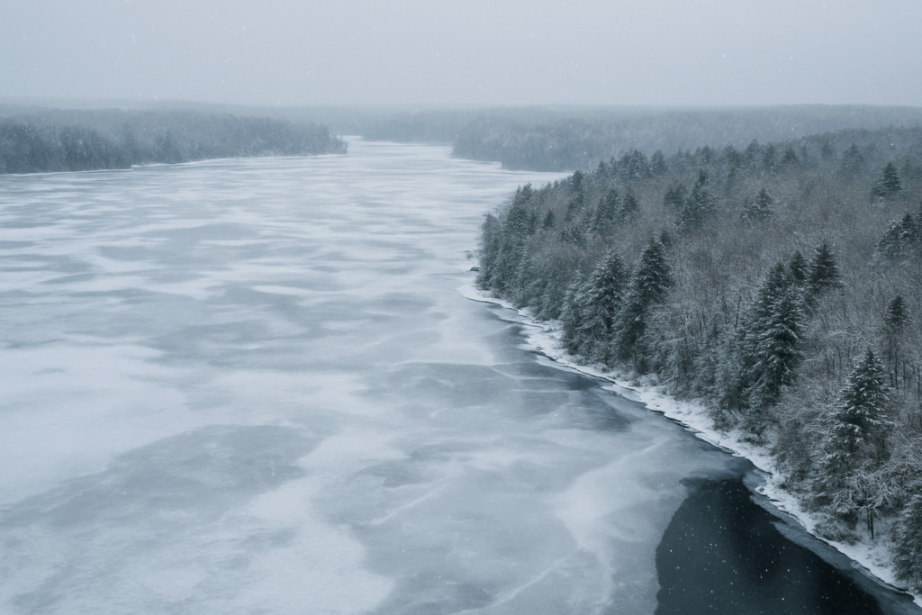 The shores of Cranberry Lake are particularly beautiful in light snow. The lake may not be completely frozen over, or it might be shrouded in a light, atmospheric mist. The contrast of the dark water (if visible) against the white shoreline is very dramatic. This is a key spot where you might see the snowmobile action we’re expecting, as the trail sometimes follows the edge of the lake or a frozen bay.